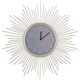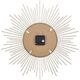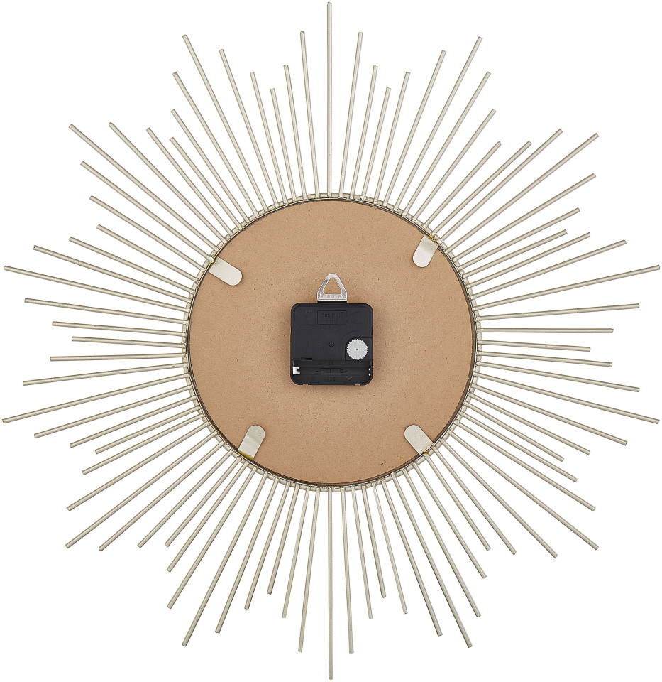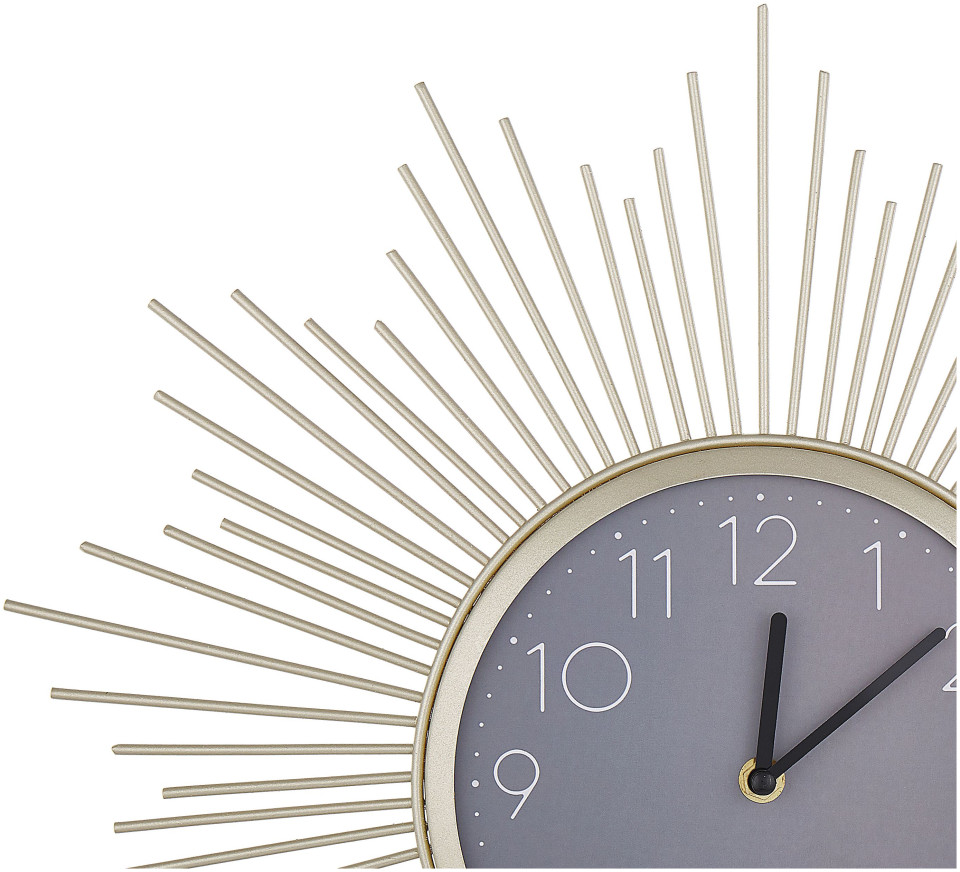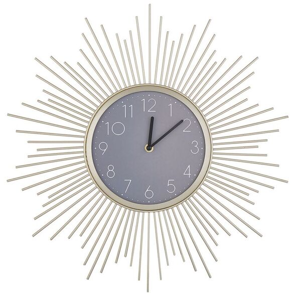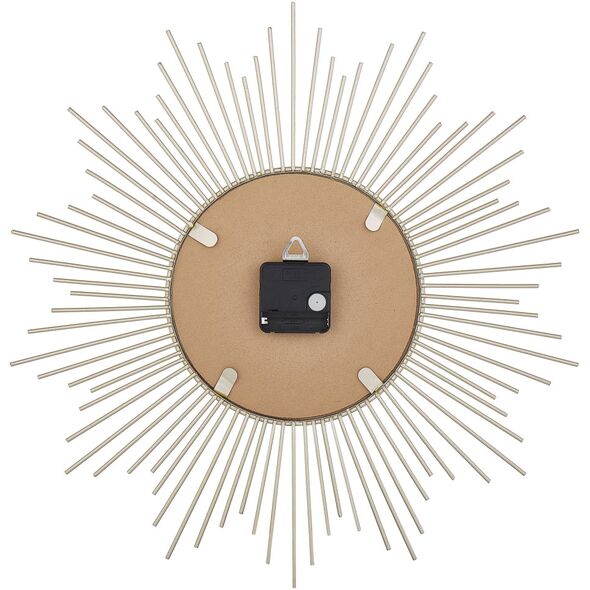Αυτό το κομψό ρολόι τοίχου σε σχήμα ήλιου θα επηρεάσει θετικά τη διακόσμηση του δωματίου σας. Η διακοσμητική του εμφάνιση, που επιτυγχάνεται συνδυάζοντας μεταλλικές ράβδους σε χρυσό χρώμα και σώμα MDF, θα είναι η τέλεια προσθήκη σε κάθε σαλόνι ή κρεβατοκάμαρα. Είναι πλήρως λειτουργικό και διαθέτει καντράν με αραβικούς αριθμούς που διευκολύνουν την ανάγνωση της ώρας. Ύψος: 45