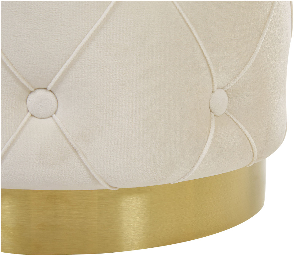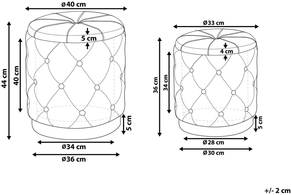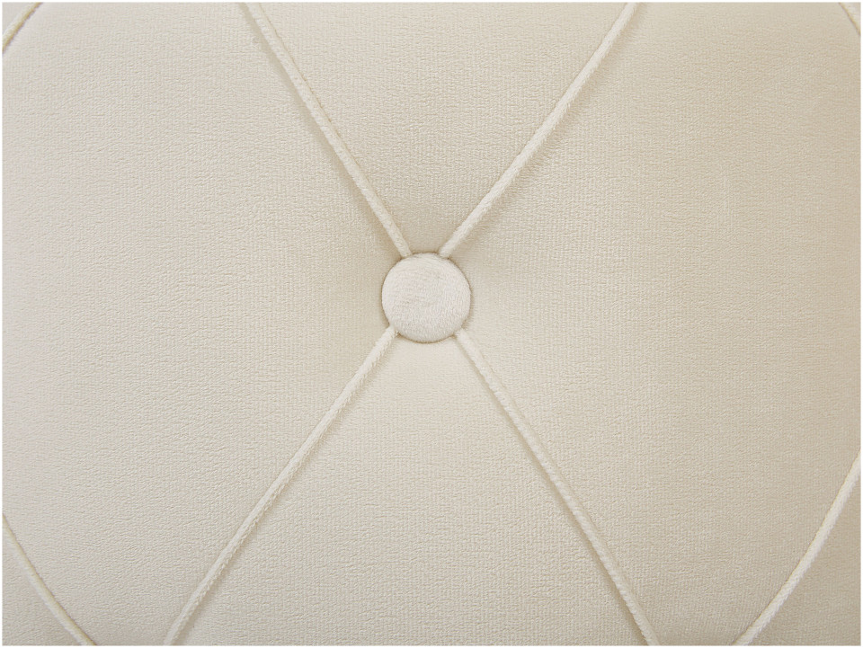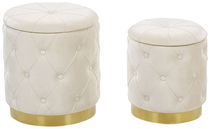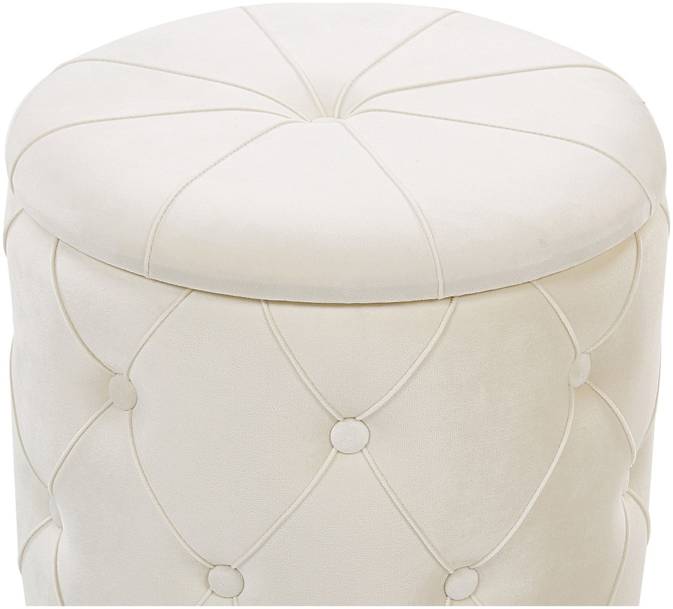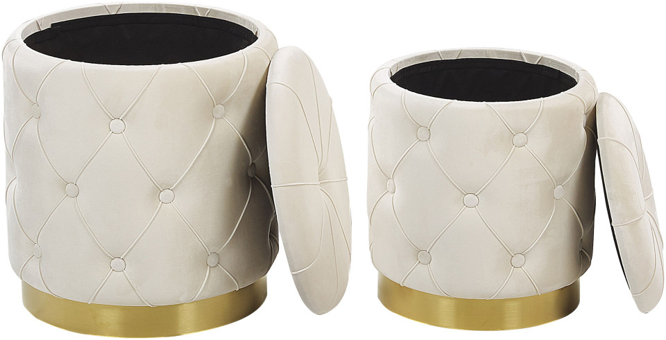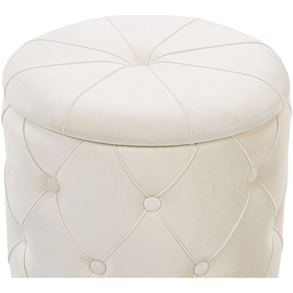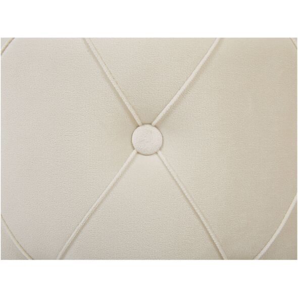 Προσθέστε μια ρετρό ατμόσφαιρα στο εσωτερικό του διαμερίσματός σας με αυτό το σετ δύο πουφ. Το μοδάτο λευκό χρώμα σε συνδυασμό με μια χρυσή βάση κάνει τα πουφ να ξεχωρίζουν από άλλα έπιπλα. Ο μοναδικός σχεδιασμός τους ενισχύεται από το πάπλωμα με κουμπιά και τις χοντρές κλωστές υλικού που συνδέονται σε όλη την επιφάνεια, δημιουργώντας ένα διαμαντένιο σχέδιο στα πουφ. Οι αποθηκευτικοί χώροι κρύβονται πίσω από τα καπάκια που βρίσκονται στα καθίσματα των πουφ. Σας επιτρέπουν να αποθηκεύετε περιττά μαξιλάρια ή καλύμματα κρεβατιού. Ύψος: 44