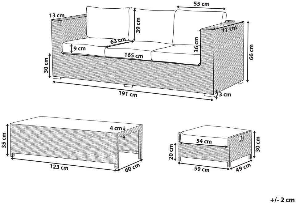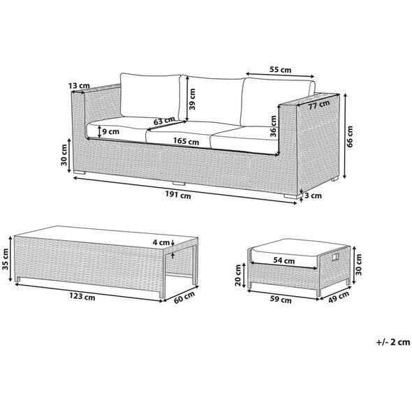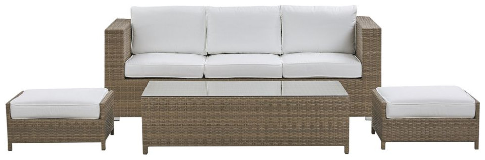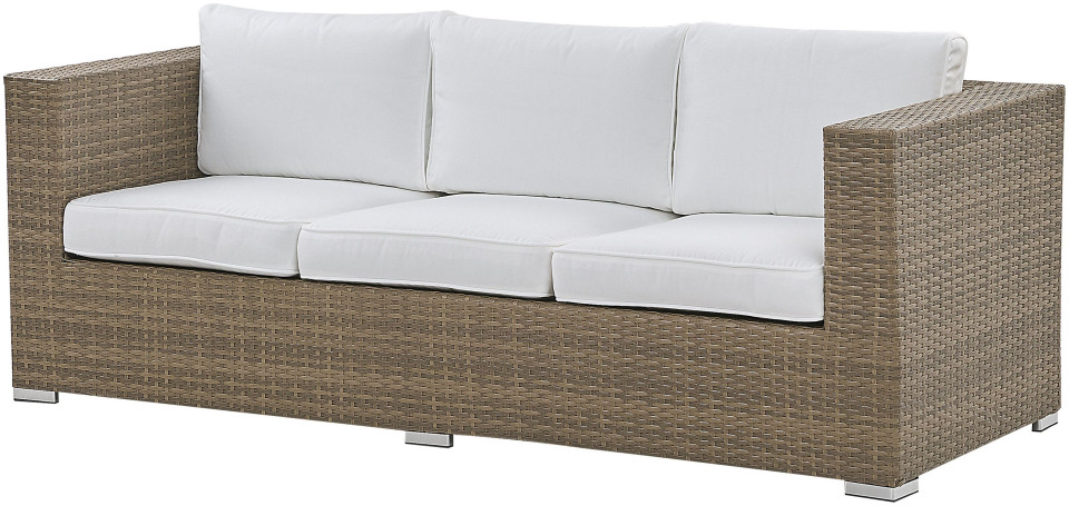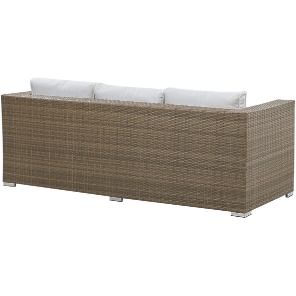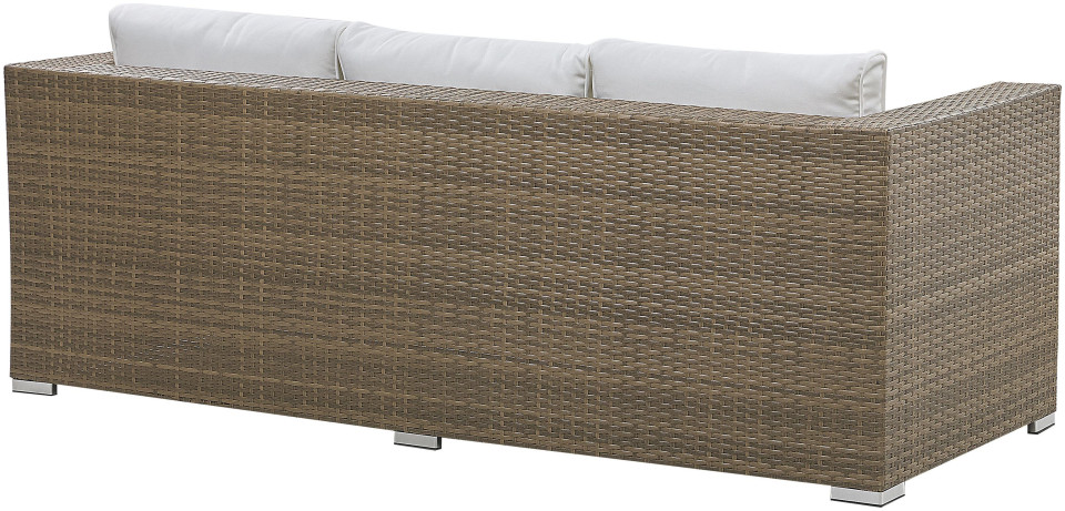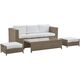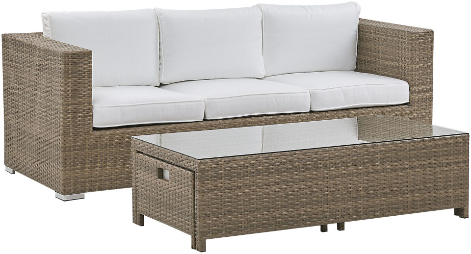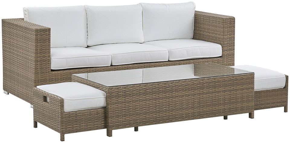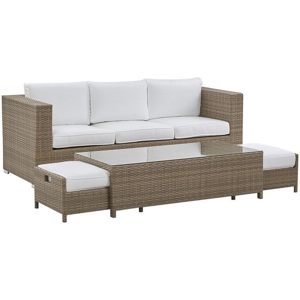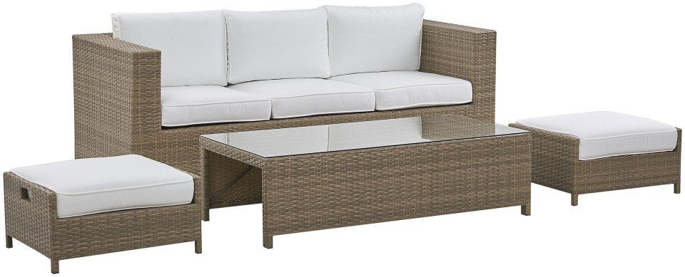 Δημιουργήστε το τέλειο μέρος για να χαλαρώσετε στον κήπο σας με αυτό το κλασικό σετ. Ο καναπές, δύο πουφ και ένα τραπέζι είναι κατασκευασμένα από ανθεκτικό και εξαιρετικά εύκολο στη φροντίδα τεχνορατάν σε ουδέτερο καφέ χρώμα. Τα χοντρά μαξιλάρια παρέχουν την υψηλότερη άνεση και το τραπεζάκι του καφέ είναι το τέλειο μέρος για πρωινό καφέ και σνακ. Το σετ αποθηκεύεται εξαιρετικά εύκολα - απλώς κρύψτε τα πουφ κάτω από το τραπέζι και τοποθετήστε το τραπέζι στο κάθισμα του καναπέ.
