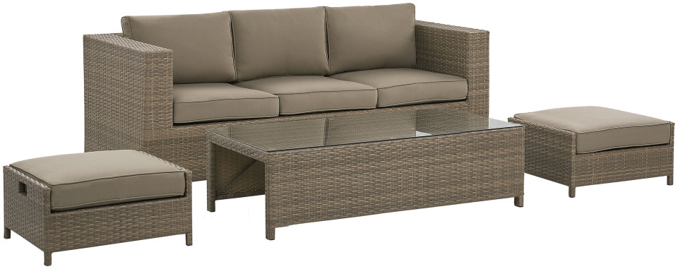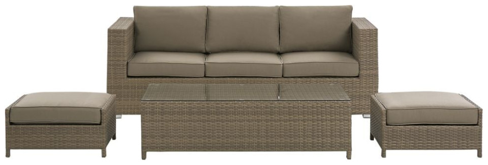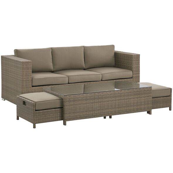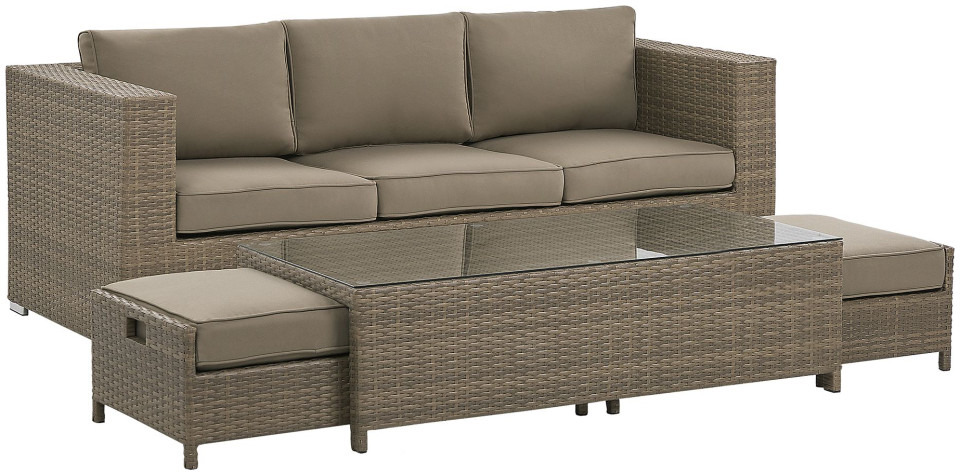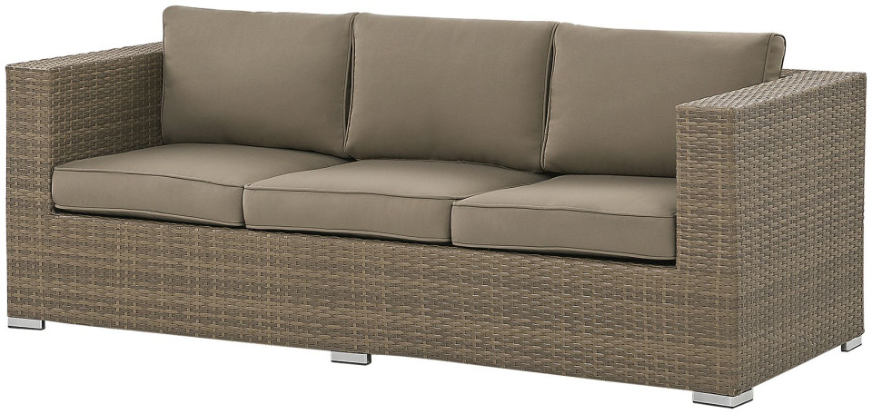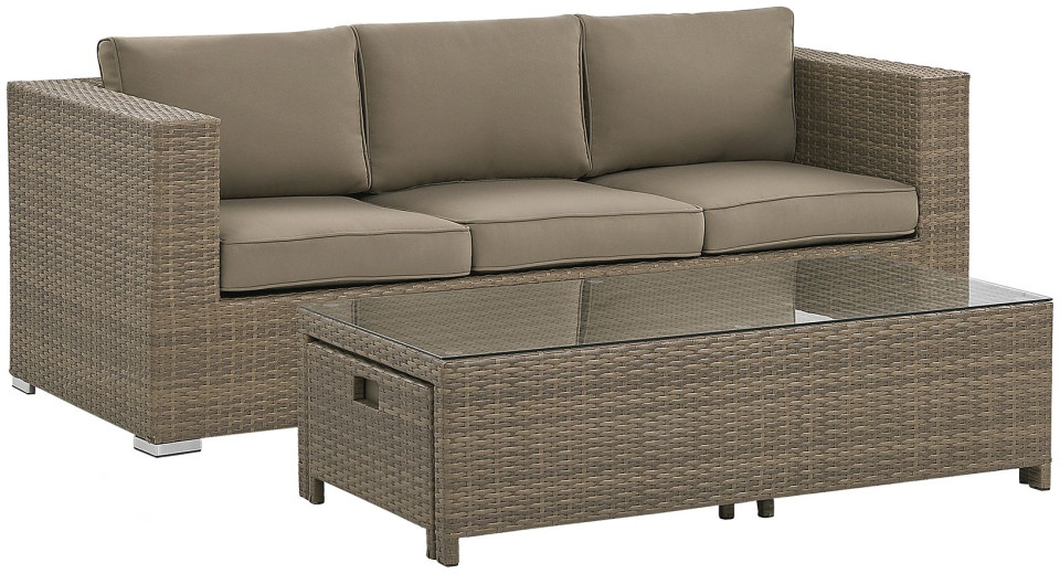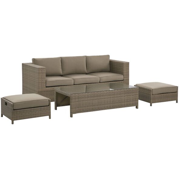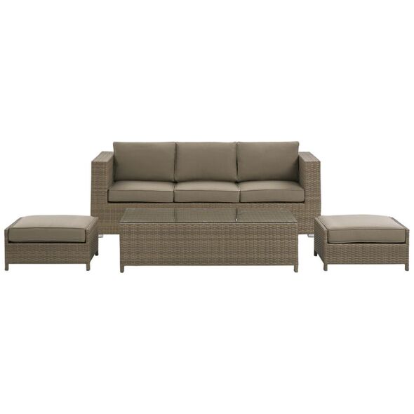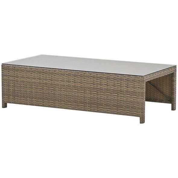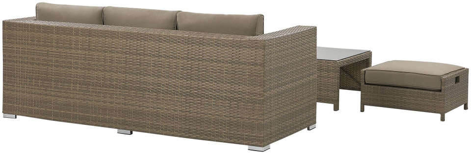 Δημιουργήστε το τέλειο μέρος για να χαλαρώσετε στον κήπο σας με αυτό το κλασικό σετ. Ο καναπές, δύο πουφ και ένα τραπέζι είναι κατασκευασμένα από ανθεκτικό και εξαιρετικά εύκολο στη φροντίδα τεχνορατάν σε ουδέτερο καφέ χρώμα. Τα χοντρά μαξιλάρια παρέχουν την υψηλότερη άνεση και το τραπεζάκι του καφέ είναι το τέλειο μέρος για πρωινό καφέ και σνακ. Το σετ αποθηκεύεται εξαιρετικά εύκολα, απλά κρύψτε τα πουφ κάτω από το τραπέζι και τοποθετήστε το τραπέζι στο κάθισμα του καναπέ