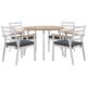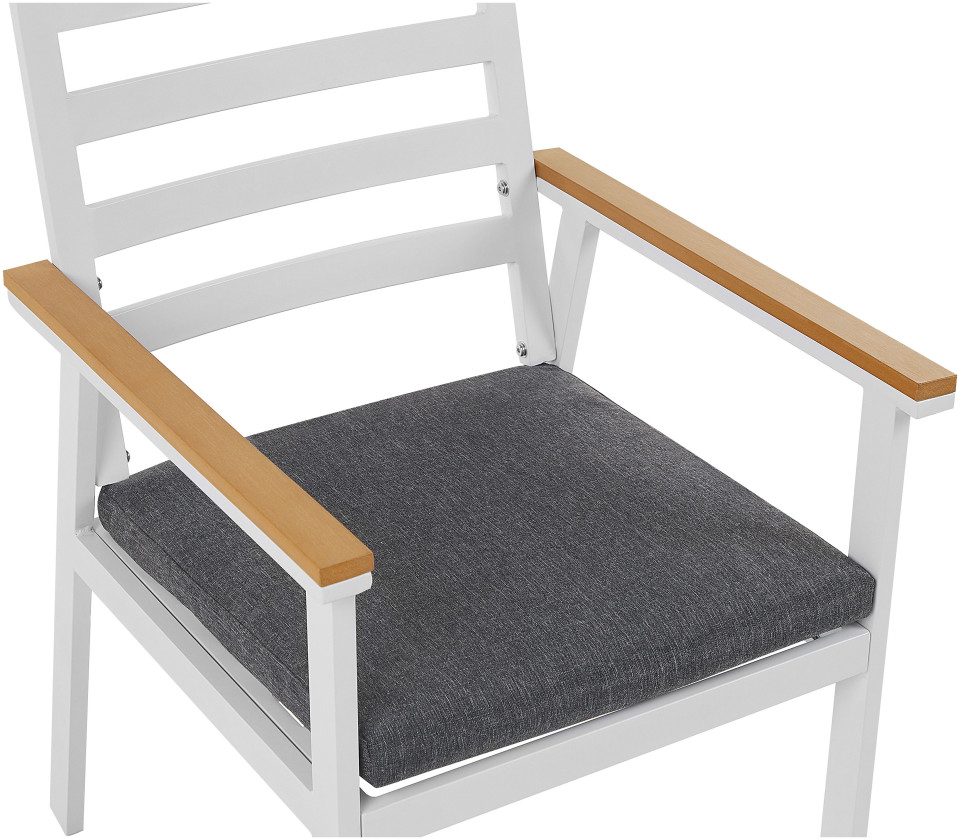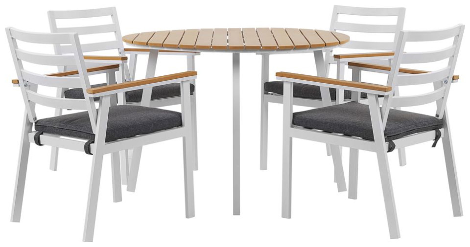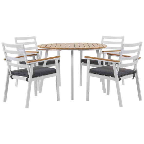 Καθίστε αναπαυτικά για δείπνο με την οικογένειά σας και απολαύστε τον καθαρό αέρα με αυτό το σετ. Ο κλασικός σχεδιασμός και τα ουδέτερα χρώματα το κάνουν να ταιριάζει απόλυτα στις περισσότερες σύγχρονες και παραδοσιακές συνθέσεις. Το τραπέζι και οι καρέκλες είναι κατασκευασμένα από ελαφρύ αλουμίνιο με λευκό φινίρισμα. Η στρογγυλή επιφάνεια παρέχει αρκετό χώρο για 4 άτομα και τα μαξιλάρια καθίσματος που περιλαμβάνονται στις καρέκλες βελτιώνουν επιπλέον την άνεση χρήσης: 38
