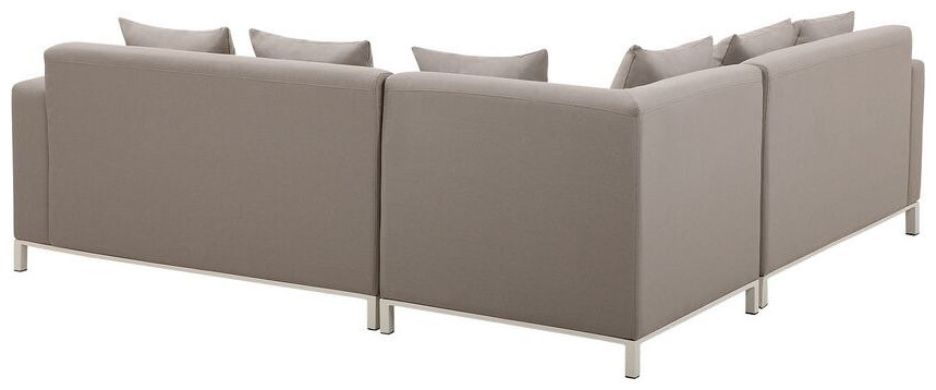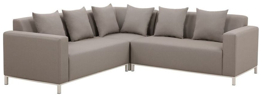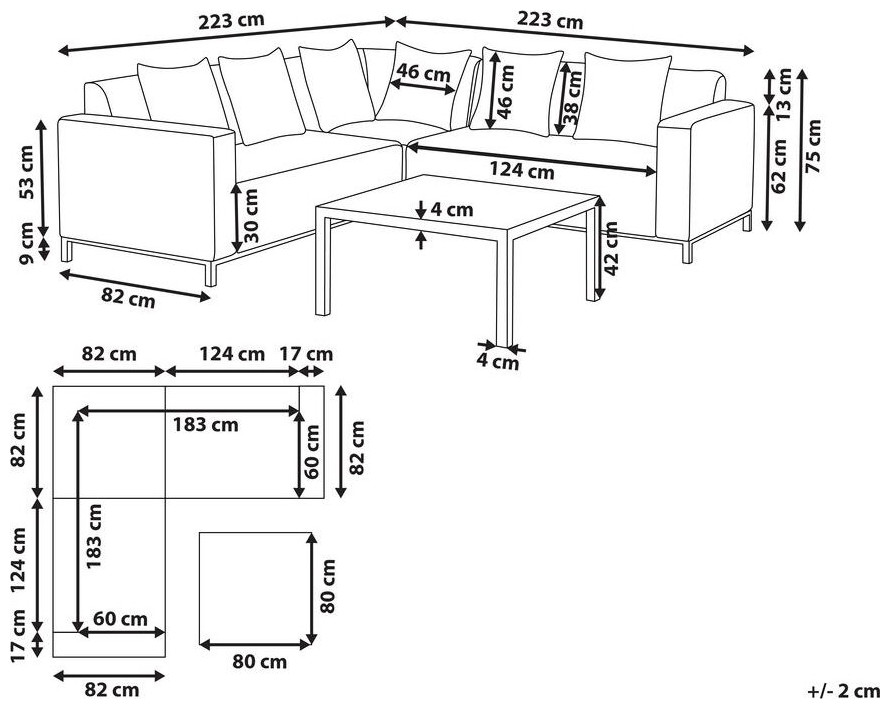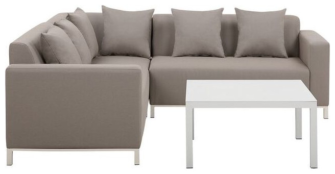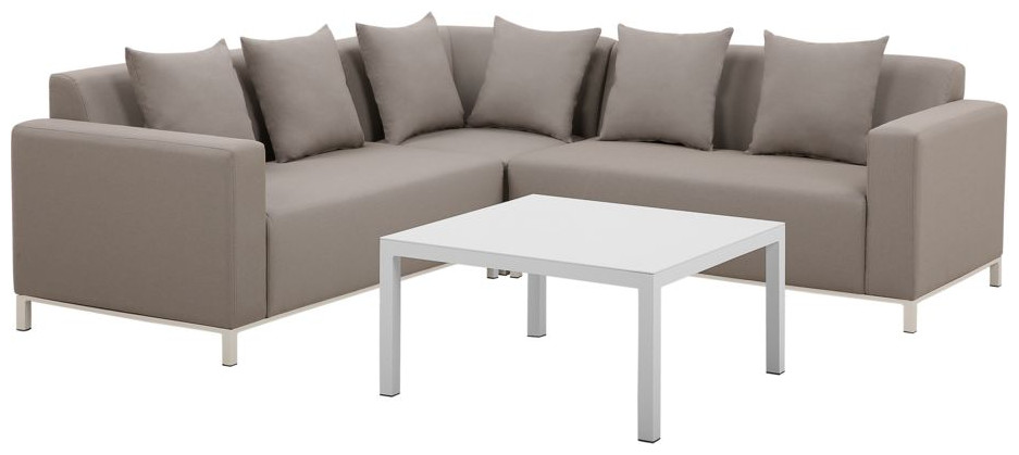 Κάντε τον κήπο σας ένα μέρος για να χαλαρώσετε ή να συναντηθείτε και εμπλουτίστε τον με αυτό το σετ. Κατασκευασμένο από μονάδες που μπορούν να τακτοποιηθούν σύμφωνα με τις ανάγκες σας, προσθέτοντας λειτουργικότητα στον καναπέ. Ολόκληρη η δομή είναι επενδυμένη με καφέ-γκρι πολυεστέρα, ο οποίος είναι ιδιαίτερα ανθεκτικός στις ακτίνες UV, χάρη στον οποίο τα έπιπλα δεν χάνουν το μοναδικό τους χρώμα. Γεμισμένα με ειδικό αφρό Quick Dry, τα έπιπλα αντέχουν επίσης τις μεταβαλλόμενες καιρικές συνθήκες και τις βροχοπτώσεις. Το σετ περιλαμβάνει επίσης τραπεζάκι σαλονιού από ανθεκτικό και εύκολο στη συντήρηση αλουμίνιο, καθώς και επιπλέον μαξιλάρια σε χρώμα που ταιριάζει με τον καναπέ. Χάρη στον μοντέρνο και μινιμαλιστικό σχεδιασμό του, αυτό το σετ θα λειτουργήσει καλά σε κάθε κήπο Βάρος: 89