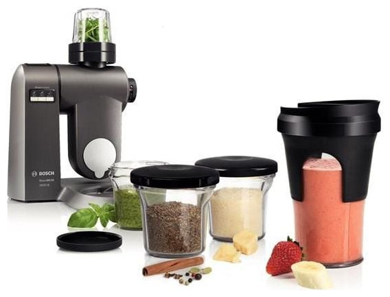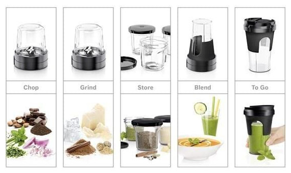 Ένα συμπαγές και γενικό πολυσύνολο με προσεγμένες λειτουργίες 5 σε 1: μύλος, κόφτης και μπλέντερ με πρακτική λύση για την αποθήκευση ToGo.
