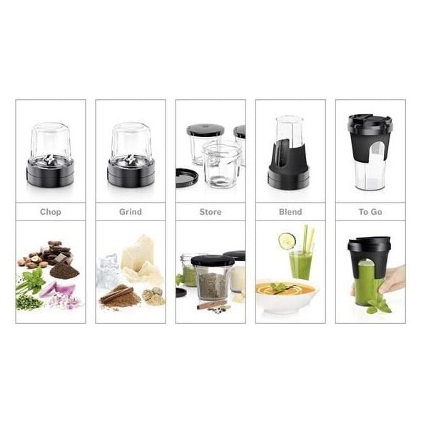 Αποτελεσματικός μύλος για άλεσμα π.χ. κόκκους καφέ, μπαχαρικά, ξηρούς καρπούς, ζάχαρη και πολλά άλλα. Ο πολυκόφτης γενικής χρήσης ψιλοκόβει γρήγορα λαχανικά, φρούτα, τυρί, βότανα για πέστο, σνακ και επιδόρπια.