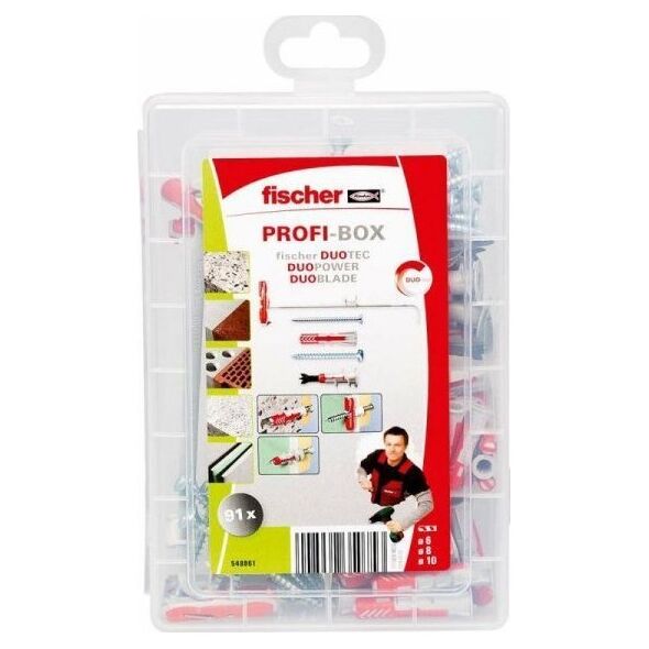 Fischer 548861. Τύπος προϊόντος: Σετ βιδών και βυσμάτων διαστολής, Κατάλληλο για υλικά: Αφρομπετόν σε αυτόκλειστο, Τούβλο, Σκυρόδεμα, Γυψοσανίδα, Γυψοσανίδα, Υλικά: Πλαστικό. Ποσότητα ανά συσκευασία: 91 τεμ., Περιλαμβάνονται βιδωτές άγκυρες: 30 x DuoPower 6 x 30, 15 x DuoPower 8 x 40, 4 x Fischer DuoTec 10, 10 x DuoBlade, Περιλαμβάνονται βίδες: 20 x βίδα SZ 4.5 x 40 βίδα SZ 5,0 x 55 ZPF, 4 x βίδα PZ 5,0 x 60