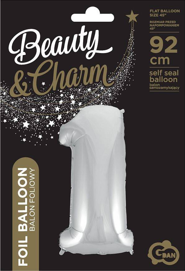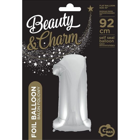 Balon foliowy Cyfra 1, srebrna, Beauty&Charm, 92 cm Wymiar balonów po napompowaniu: ok. 92 cm. Kolor: srebrny. Balony są przeznaczone do napełnienia helem. Napełnienie ich powietrzem spowoduje, że balony nie będą się unosić. Opakowanie zawiera 1 szt. Producent: GoDan S.A. Balony nie są napełnione helem. Przepiękny, duży srebrny balon foliowy na hel w kształcie cyfry 1 (jeden). Idealny na imprezę z okazji 1 urodzin, roczek, pierwszej pracy, awansu, rocznicy oraz jako dodatek do innych balonów i kompozycji z okazji urodzin lub rocznic. Większe liczby można tworzyć dodając inne balony dostępne w naszej ofercie. Balon jest wykonany z mocnej, wytrzymałej folii z możliwością dopompowywania w przyszłości (np. za pomocą słomki aby uzupełnić ubytki helu). Pięknie się prezentuje i długo utrzymuje gaz (hel / powietrze). Posiada także specjalne wypustki umożliwiające przywiązanie dodatkowych - przytrzymujących lub stabilizujących wstążeczek lub ciężarków.waga produktu [gramy]:41
