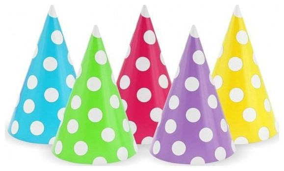 PAPIEROWE CZAPECZKI URODZINOWE, KOLOROWE W BIAŁE GROCHY Średnica: 11 cm Rozmiar: uniwersalny Mocowanie: na elastycznej gumce Kolor: wielokolorowy Nadruk: białe groszki Materiał: papier Ilość sztuk w opakowaniu: 100 Producent: Godan S.A.