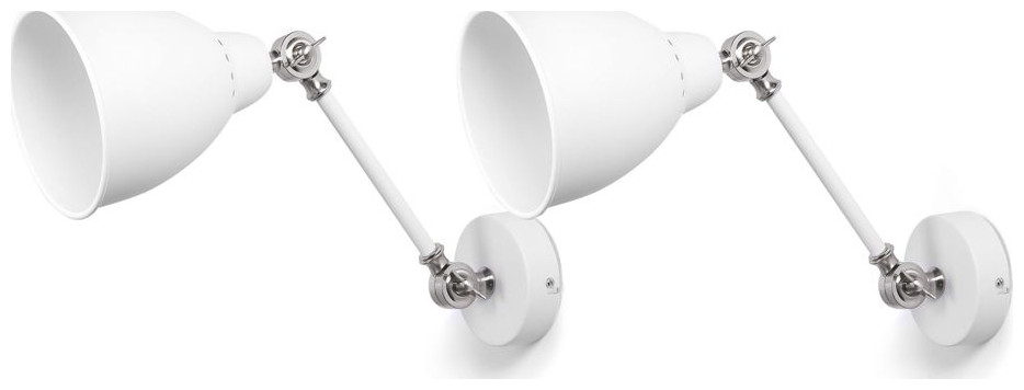 Ένα σετ δύο πρακτικών λαμπτήρων που, όταν τοποθετηθούν πάνω από το κρεβάτι, θα λειτουργήσουν τέλεια ως λάμπες ανάγνωσης. Εξοπλισμένα με ρυθμιζόμενο βραχίονα, σας επιτρέπουν να ρυθμίζετε ελεύθερα την κατεύθυνση του φωτός για μέγιστη άνεση στη χρήση. Κατασκευασμένο από μέταλλο, εγγυάται ανθεκτικότητα και ο κλασικός σχεδιασμός τους τα κάνει να ταιριάζουν τέλεια σε κάθε μοντέρνο εσωτερικό. Ύψος: 23