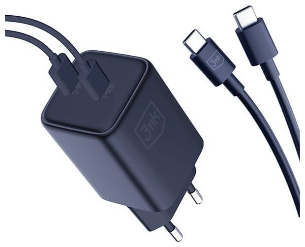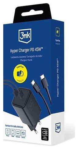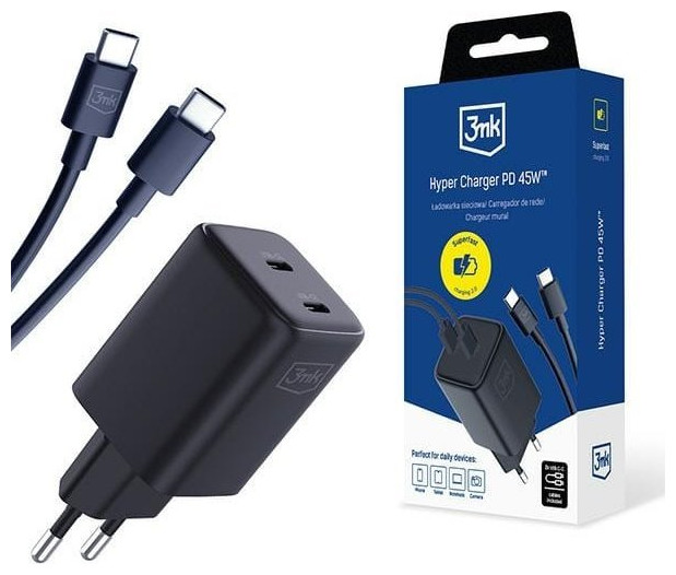The 3MK Hyper Charger PD 45W main s charger is the ideal solution for people who need fast and reliable charging for their mobile devices. It comes with two USB-C / USB-C cables for maximum compatibility with modern smartphones and tablets.