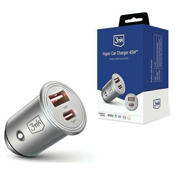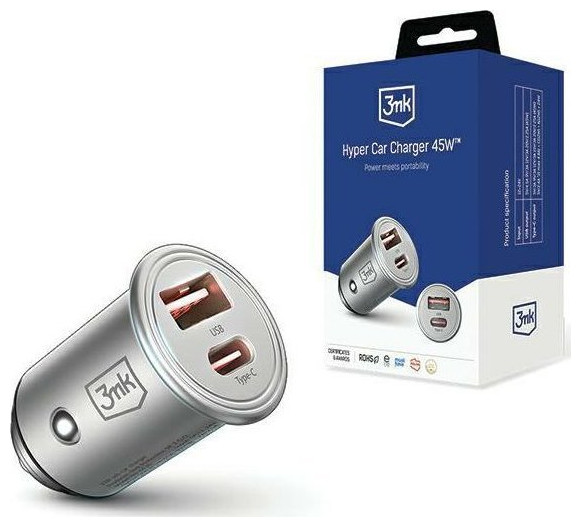 3MK Hyper Car Charger 1x USB-A 1x USB-C 3 A (Hyper Car Charger 45W){Χρώμα} Ασημί . {Cable length} Δεν ισχύει. {Τύπος φορτιστή} Προσαρμογέας . {Cable connector type} Δεν ισχύει . {Amperage} 3 A . {Περιλαμβάνεται καλώδιο} Αρ. {Αριθμός εξόδων USB-A} 1 . {Αριθμός εξόδων USB-C} 1 . {Quick Charge} Γρήγορη φόρτιση. {Τάση εισόδου} 12/24 V . {Ισχύς φόρτισης} 45 W . {Αριθμός φορτισμένων συσκευών} 2