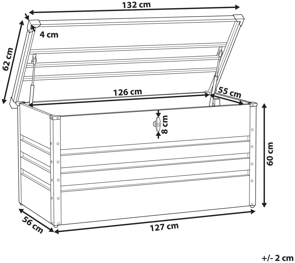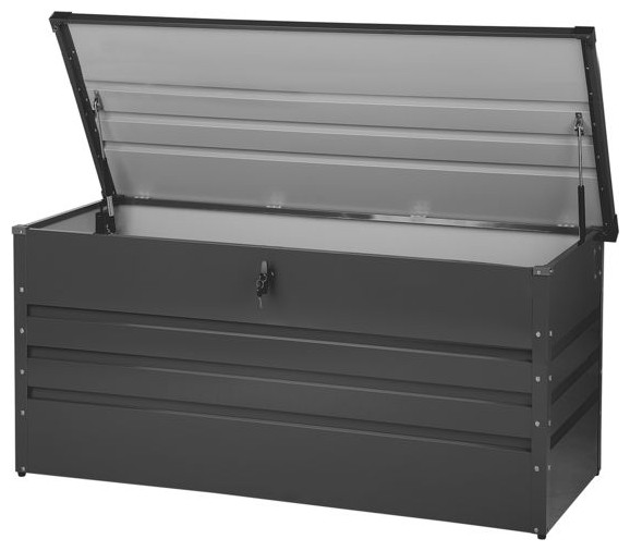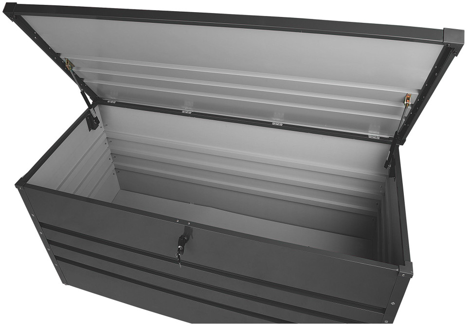 Przechowuj swoje narzędzia, poduszki czy koce i inne ogrodowe dodatki w tej pojemnej skrzyni, wykonanej z ocynkowanej stali. Wieko skrzyni wyposażone jest w podnośnik gazowy, co znacznie ułatwia otwieranie i zamykanie pokrywy, a obrotowy zamek zapewnia bezpieczeństwo przechowywanych w skrzyni rzeczy. Wysokość: 64 Szerokość: 132 Głębokość: 62 Waga: 24.6 Materiał: Stal